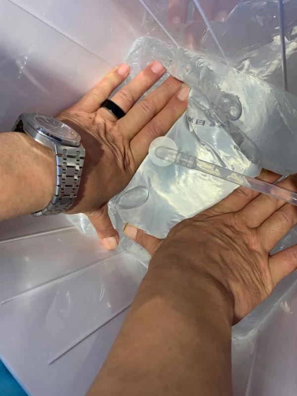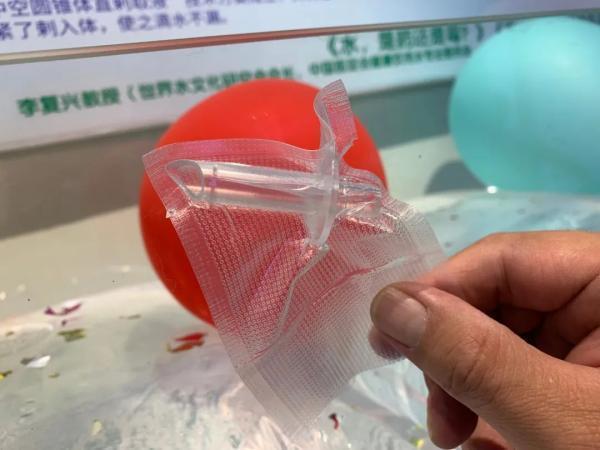 原来,这里是一处袋装水展示区,店员正在给在场的市民演示袋装水的使用方法。只见店员手中拿着一包袋装水,袋装水通体透明,在袋子正面印有包装水的名称,背面印着袋装水的成分表。店员把袋装水的外包装剪开后将内袋取出放入饮水机内,又取来一个“塑料针管”用力刺入内袋,令现场观众惊奇的是,这个包装袋不像普通塑料袋那样有水滴渗出来。店员又将水管与针管连接,启动饮水机开关,就可以直接饮用。